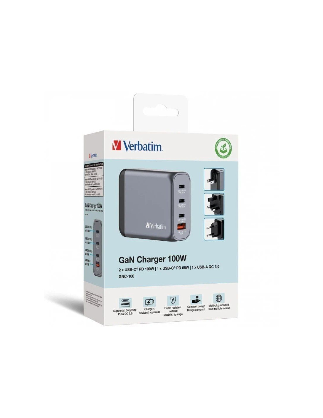 El cargador de pared GaN de 100 W de Verbatim consolida múltiples cargadores en uno, combinando dos puertos USB-C PD 100 W, un puerto USB-C PD 65 W y un puerto USB-A QC 3.0 (EU/UK/US) en un elegante diseño que cabe en la palma de la mano. Ideal para la oficina, el hogar o los viajes, para alimentar su portátil, tableta, smartphone, dispositivos de juego, etc.