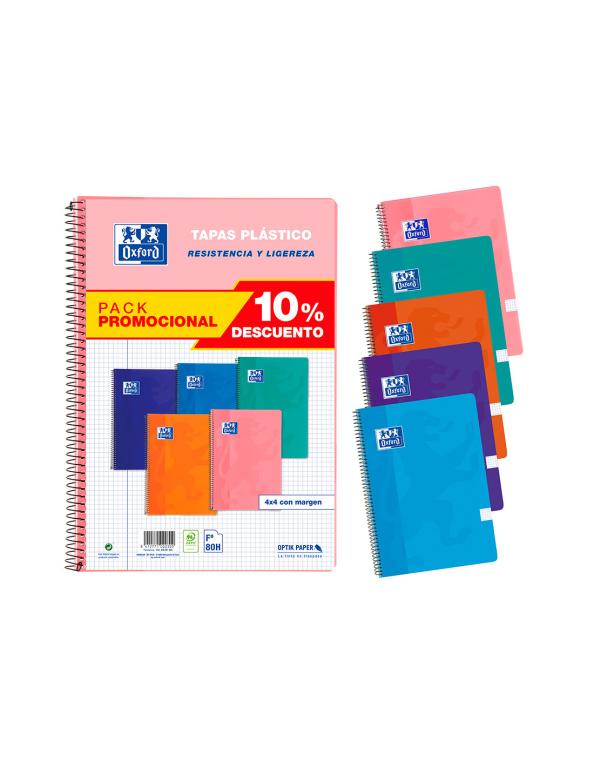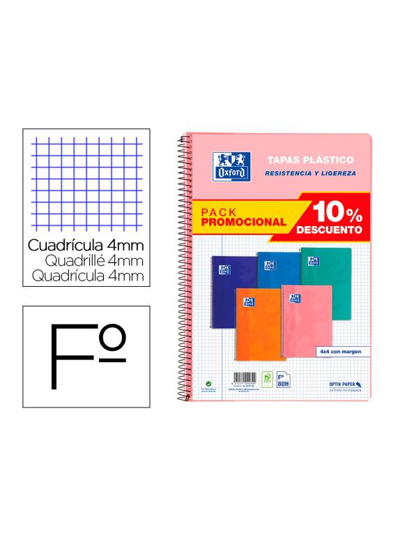 Cuaderno espiral oxford tapa plastico folio 80 hojas cuadro 4 mm pack 5 unidades colores tendecias
