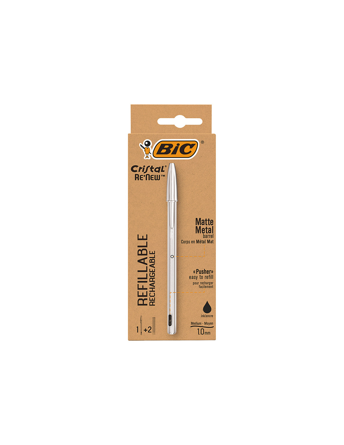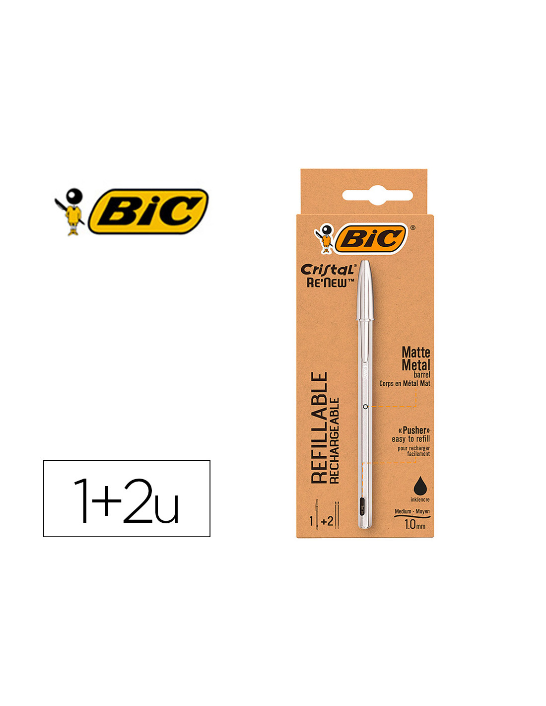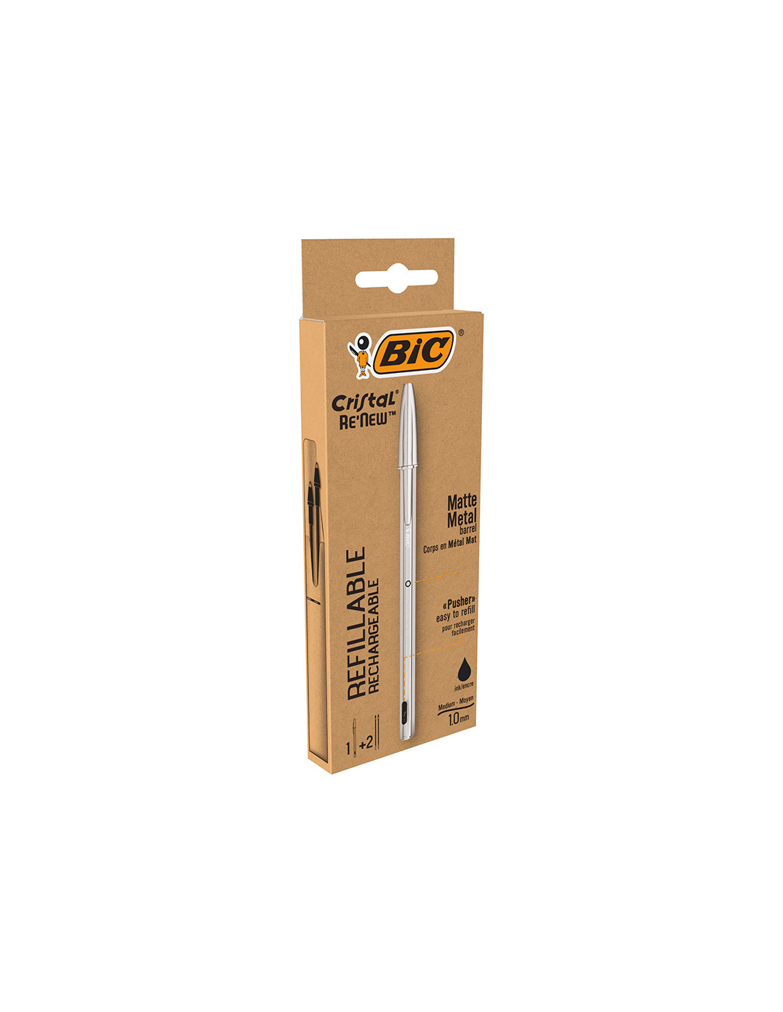Boligrafo bic cristal renew cuerpo en aluminio mate tinta negro + 2 recambios en caja de carton
