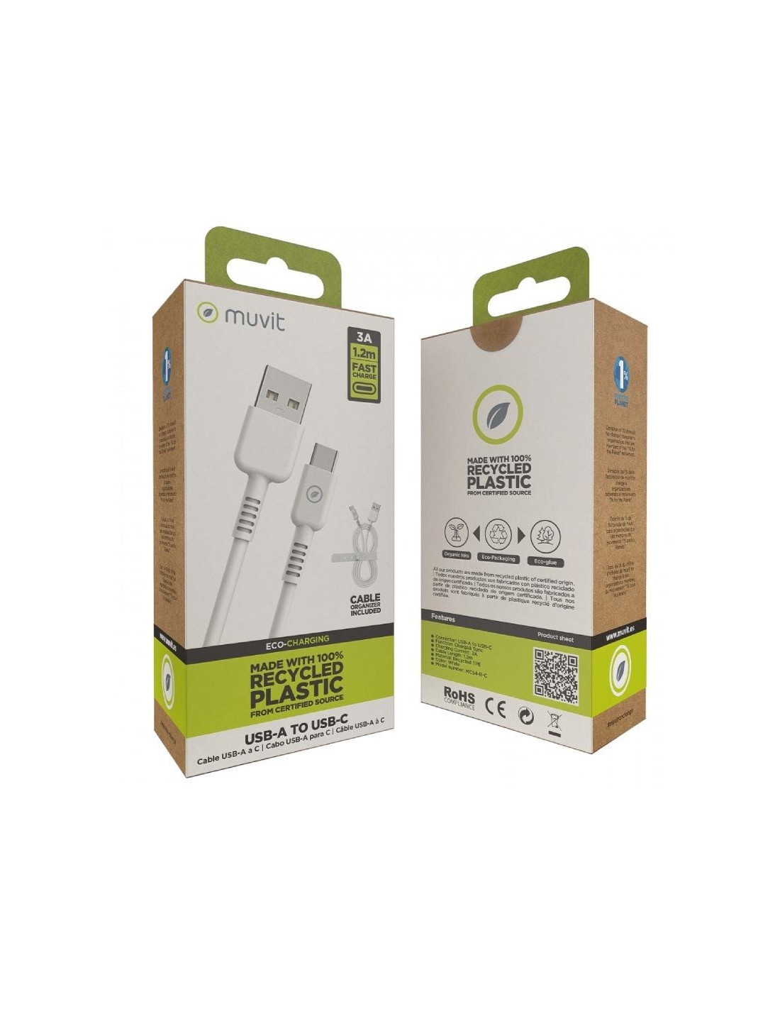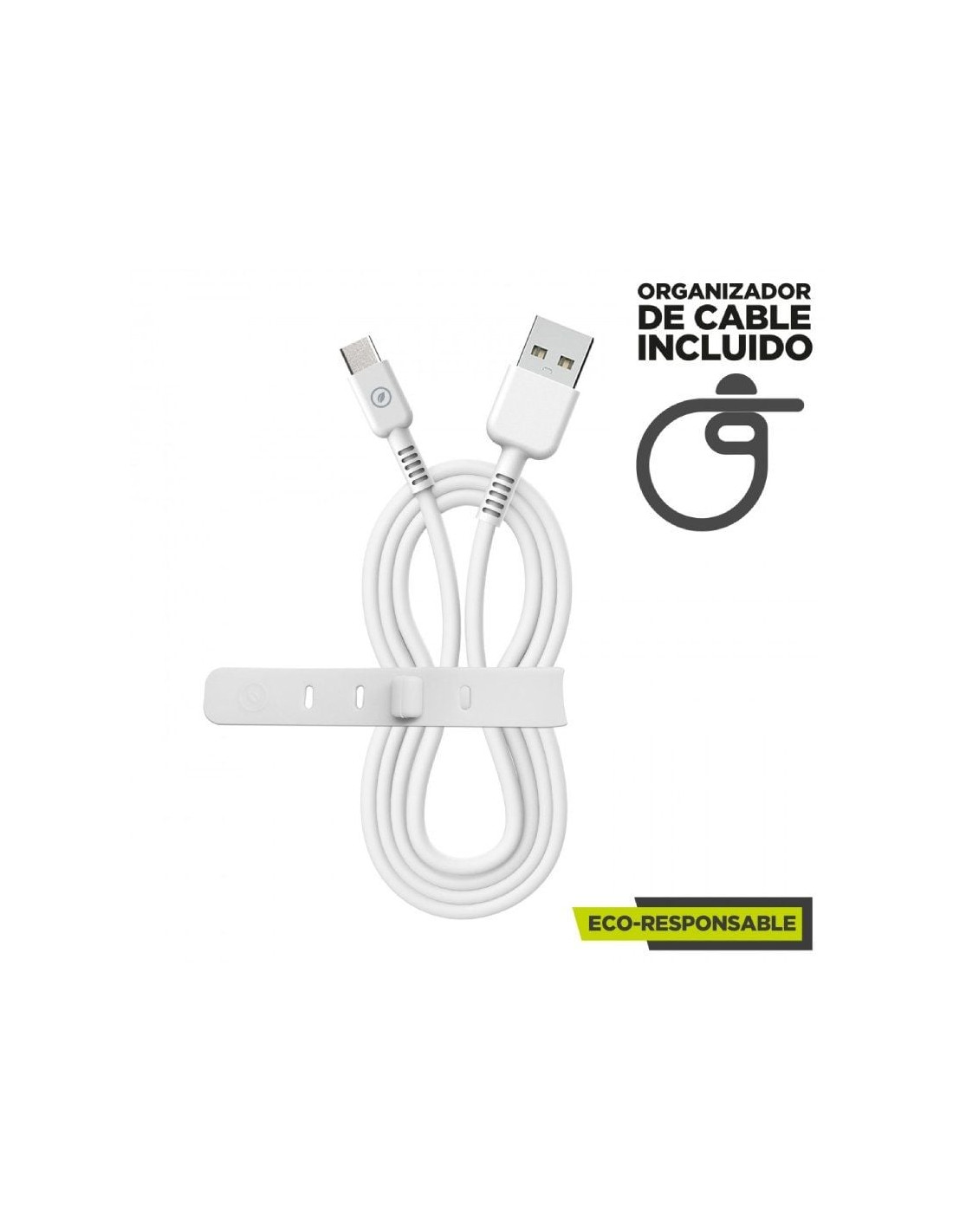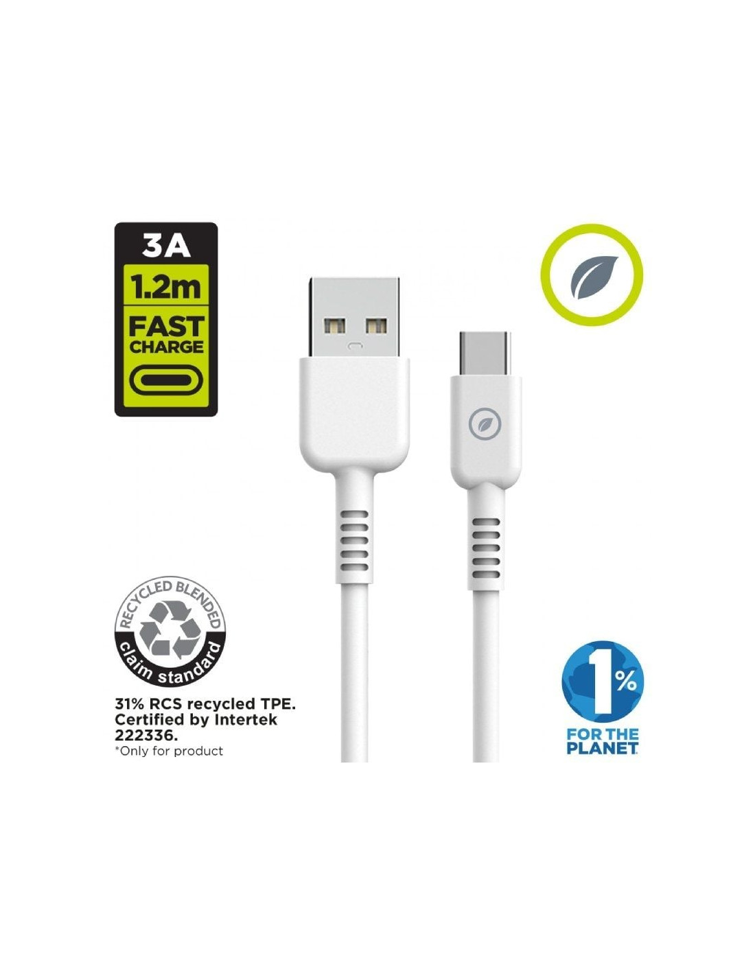 Cable para carga y transferencia de datos con conector USB a Tipo C, 3A transferencia rápida, 1,2m de longitud, en color blanco y 100% reciclable. Con un diseño patentado y homologado con el certificado CRS, conforme son productos reciclables y hechos con productos reciclados. Carga tus dispositivos cuidando el planeta en el proceso, y llévate de regalo un organizador de cables gratuito.