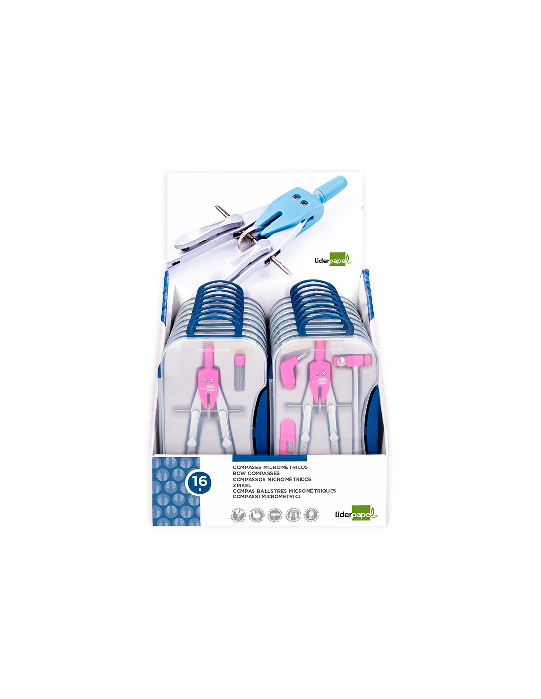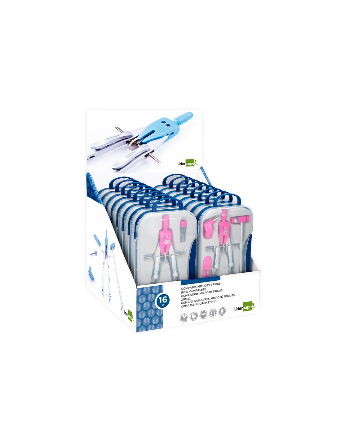Compas liderpapel con adapatador alargadera y mango extra soft expositor de 16 estuches 2 modelos