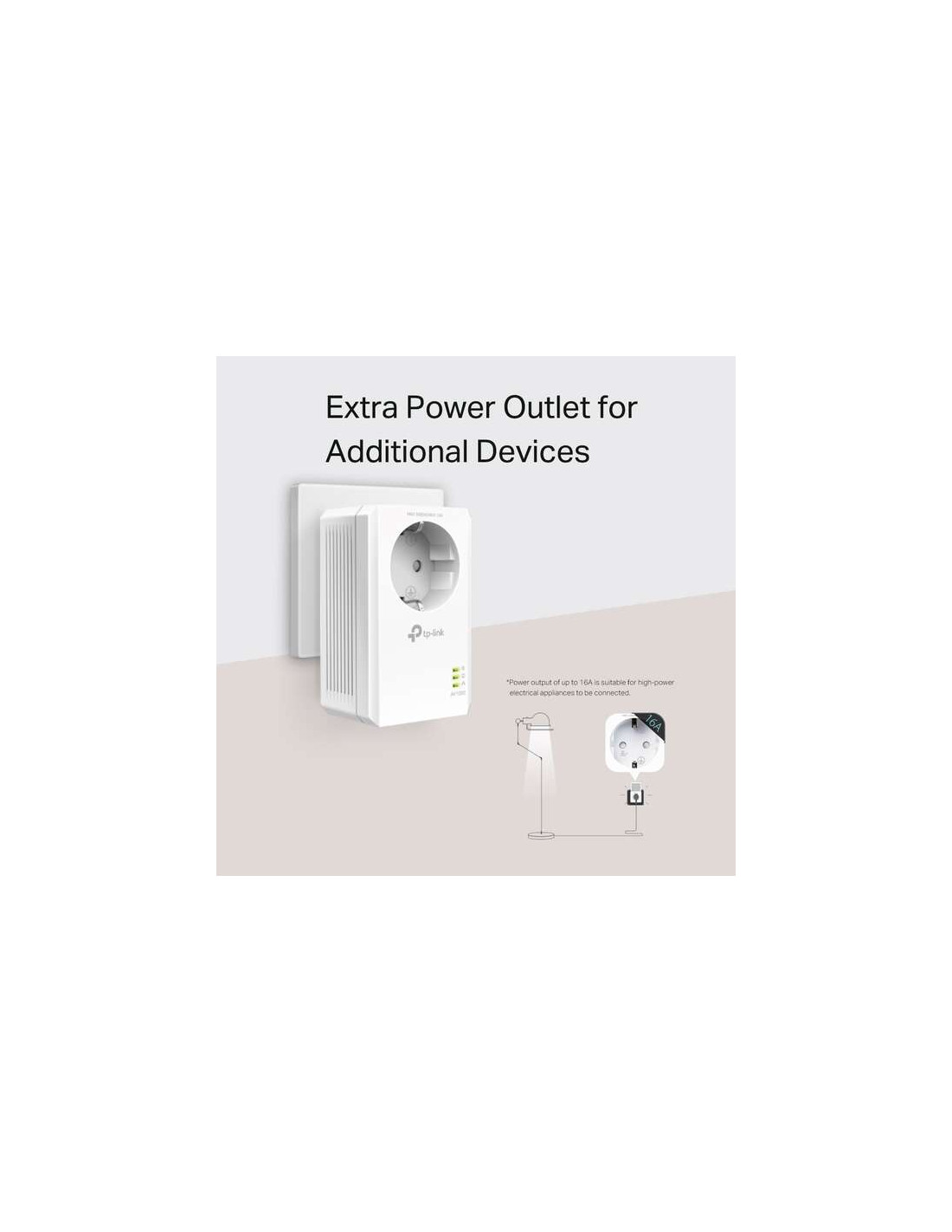 Enchufe Incorporado Para Dispositivos Adicionales.¿Te resulta difícil conectar tus dispositivos? El KIT TL-PA7017P tiene una toma de corriente de CA integrada. Su adaptador de línea eléctrica ahora se puede usar como una toma de corriente tradicional. Conecta tu televisor inteligente o consolas de juegos al adaptador. No queda zócalo que perder.El filtro de ruido incorporado ayuda a evitar que el ruido de la señal eléctrica afecta al rendimiento de tu línea eléctrica.* La potencia de salida de hasta 16 A es adecuada para conectar aparatos eléctricos de alta potencia.