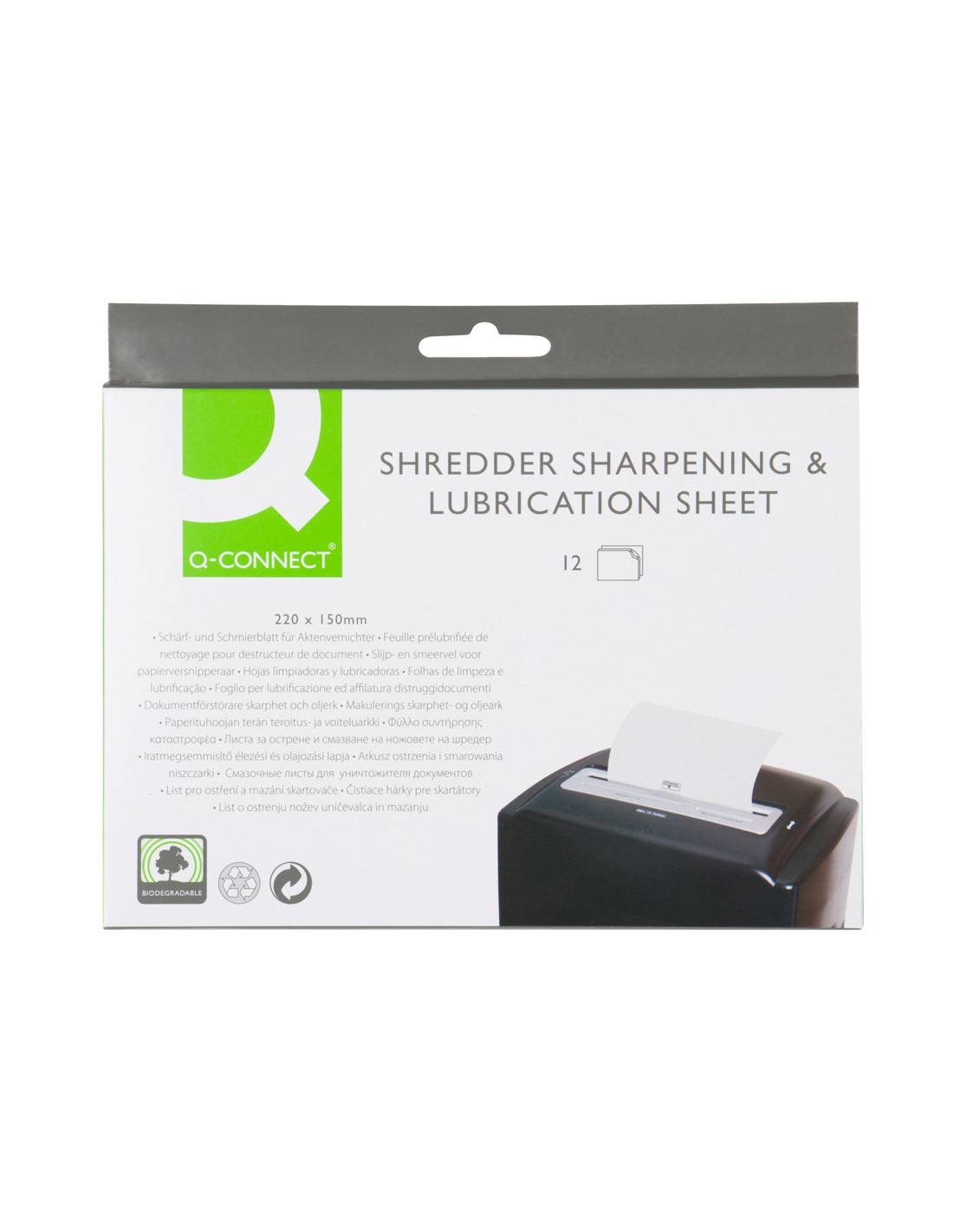 Las hojas lubricantes y afiladoras Q-Connect están diseñadas para optimizar el funcionamiento de su destructora de documentos, extendiendo su vida útil y mejorando su rendimiento. Estas hojas son esenciales para mantener las cuchillas limpias, afiladas y libres de oxidación, lo que se traduce en un corte más eficiente y una reducción significativa en el riesgo de atascos.