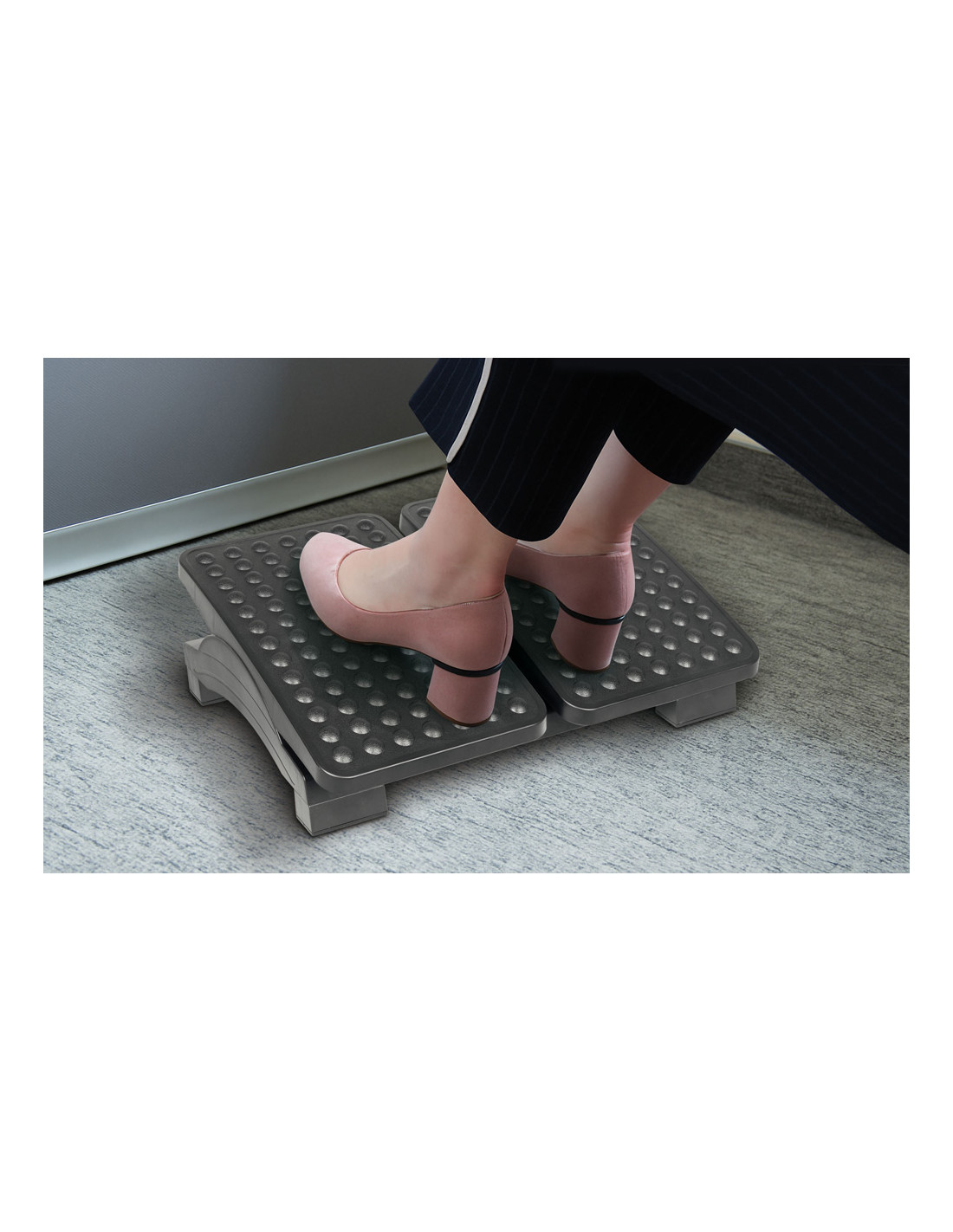 Posición cómoda de los pies: reposapiés de alta calidad con superficies deapoyo separadas. Ergonómico: favorece una mejor circulación, pies calient es, postura relajada y saludable al sentarse. Individual: posición cómoda de los pies seleccionable por separado para cada lado. Tacos de plástico para mejor agarre al estar sentado o de pie. Muy estable: fabricado en plástico de alta calidad (PS resistente a los impactos). Funcional: dos alturas, inclinación ajustable . Diseño inteligente: sin barras molestas para mayor libertad de movimiento lateral. Estable, las almohadillas de goma protegen el suelo. Altura de 10,5 cm o 13 cm. Efecto de masaje gracias a los grandes tacos: mover los pies sin zapatos para estimular la planta.También para compensar mesas de altura fija. Envase ecológico reciclable, sin plástico.