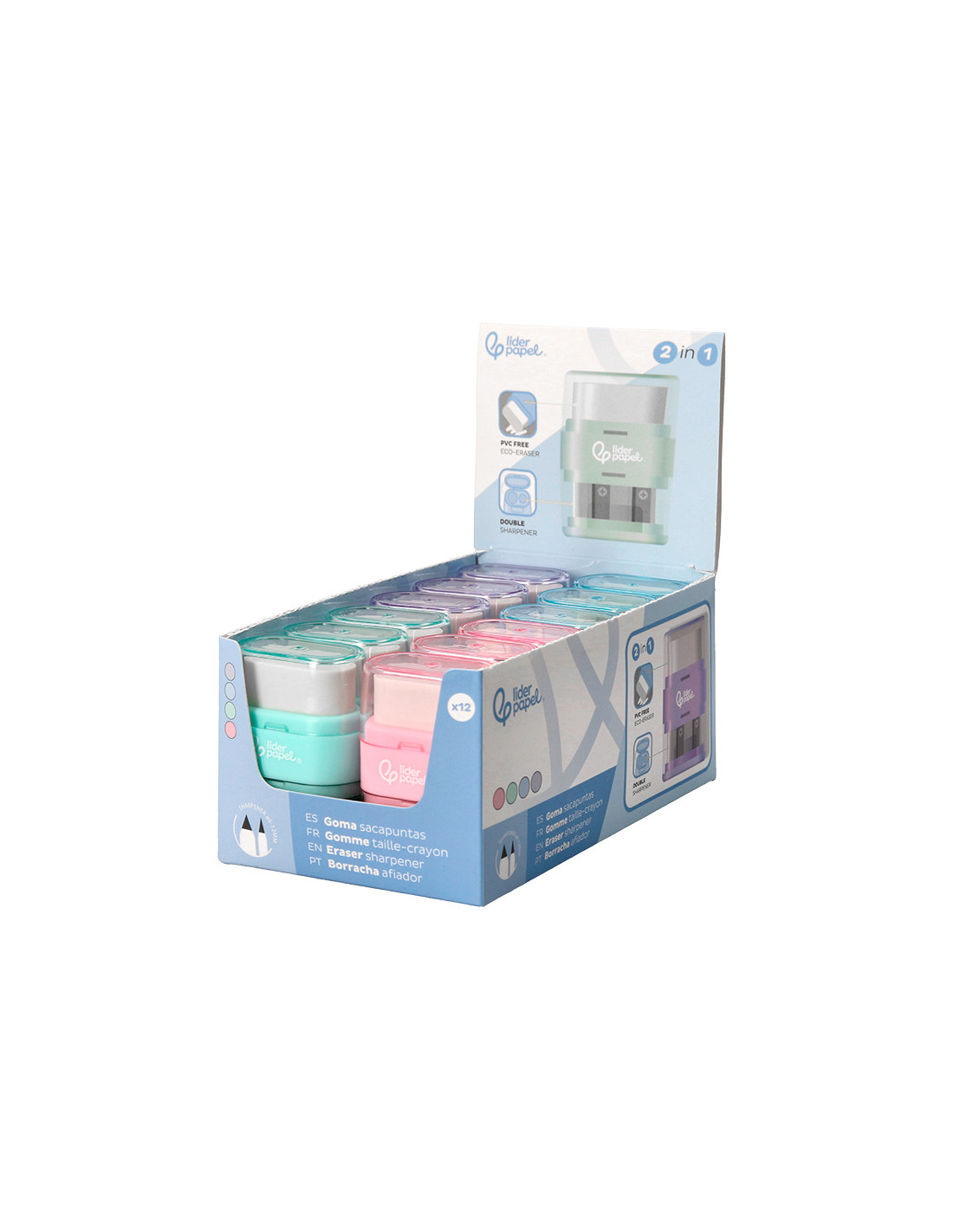 Goma de borrar liderpapel rectangular con protector plastico sacapuntas 2 usos colores surtidos