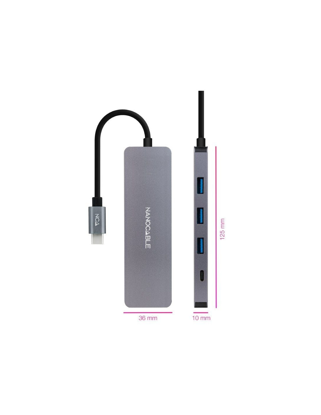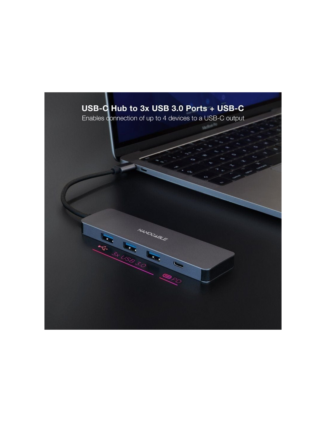- Hub USB-C USB3.0 macho en un extremo y 3 puertos USB3.0 tipo A hembra más 1 puerto USB3.0 tipo C hembra en el otro