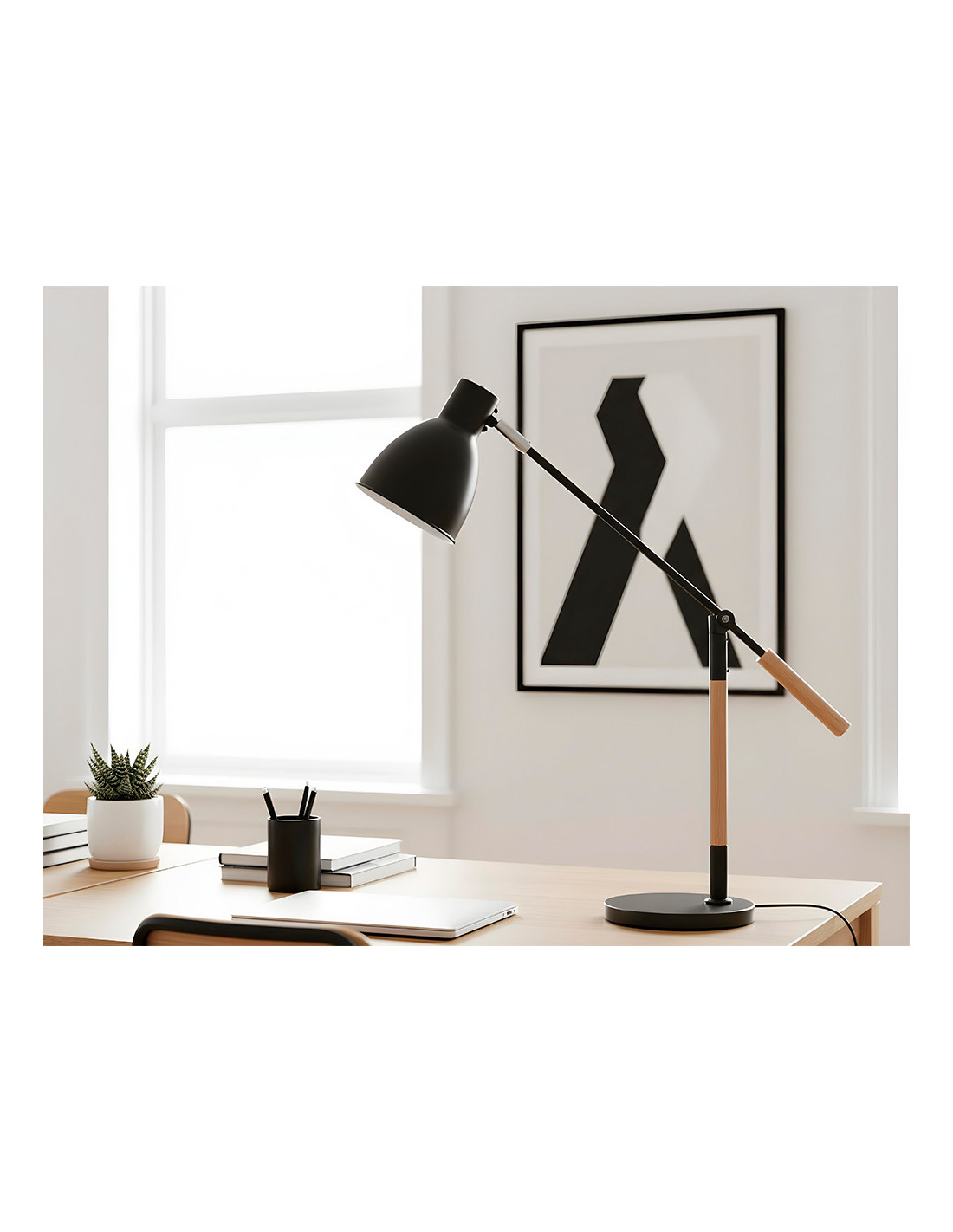 La lámpara de escritorio Q-Connect Deneb combina funcionalidad y diseño en un solo producto, ideal para quienes buscan una iluminación adecuada y adaptable en su espacio de trabajo o estudio. Su estructura metálica negra, complementada con detalles en madera, aporta un estilo moderno con un toque cálido, mientras que sus dos articulaciones permiten orientar la luz con precisión para una óptima visibilidad.