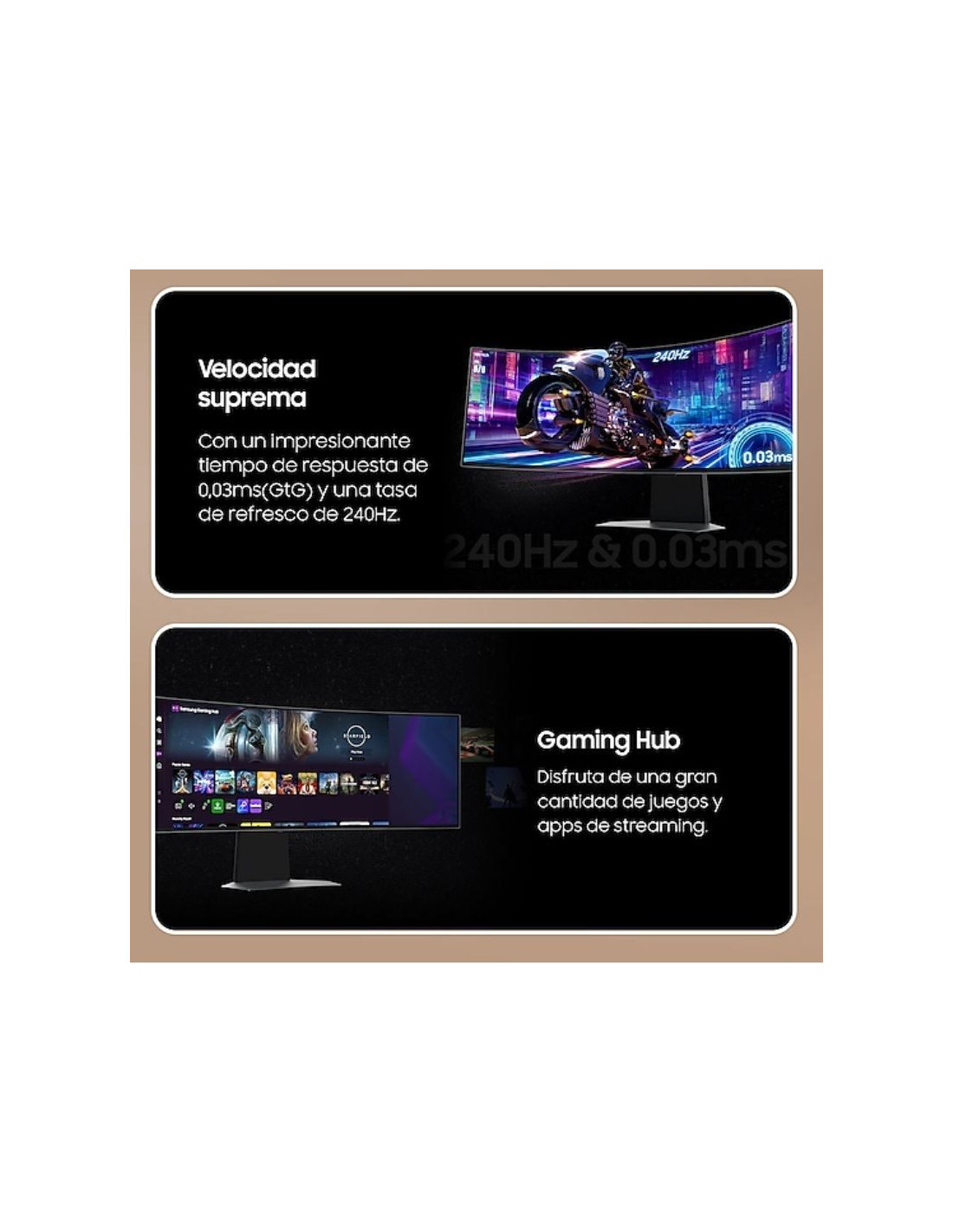 Tiempo de respuesta (GtG) casi instantáneo, de solo 0,03 ms. Las conexiones HDMI 2.1 y DisplayPort también te ayudan a ganar ventaja, ya que ofrecen tasas de refresco de 240 Hz en resolución UHD.