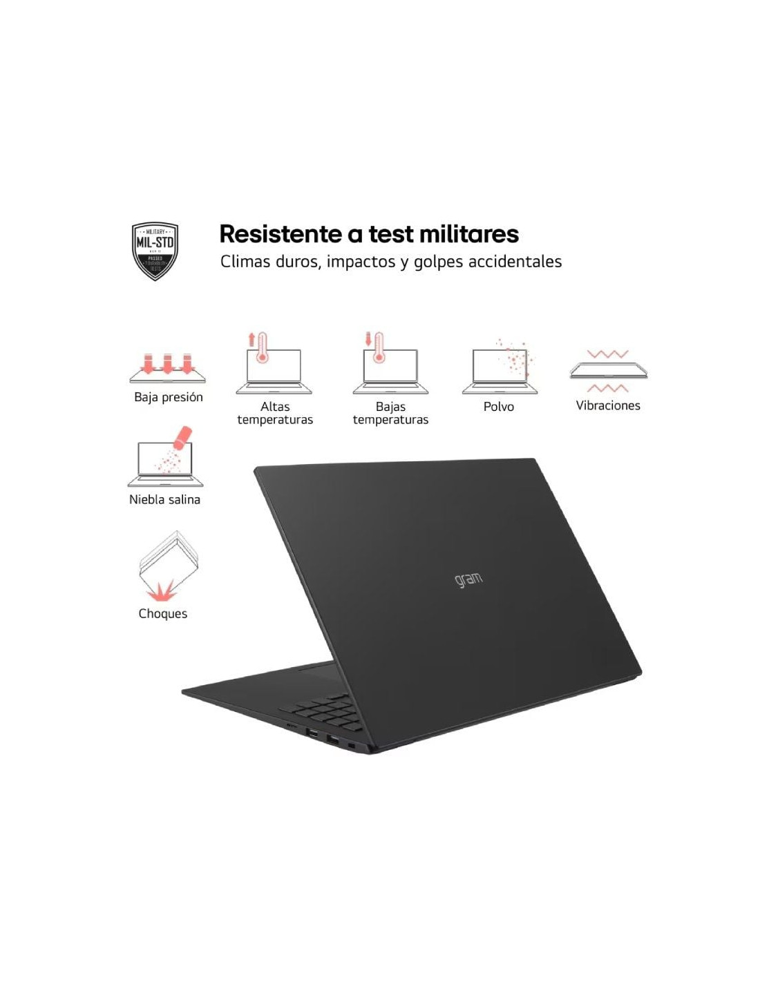 Fabricado con un material duradero pero ligero, LG gram ha sido sometido a un test de durabilidad militar de siete niveles de resistencia. Funciona incluso en las condiciones más duras.