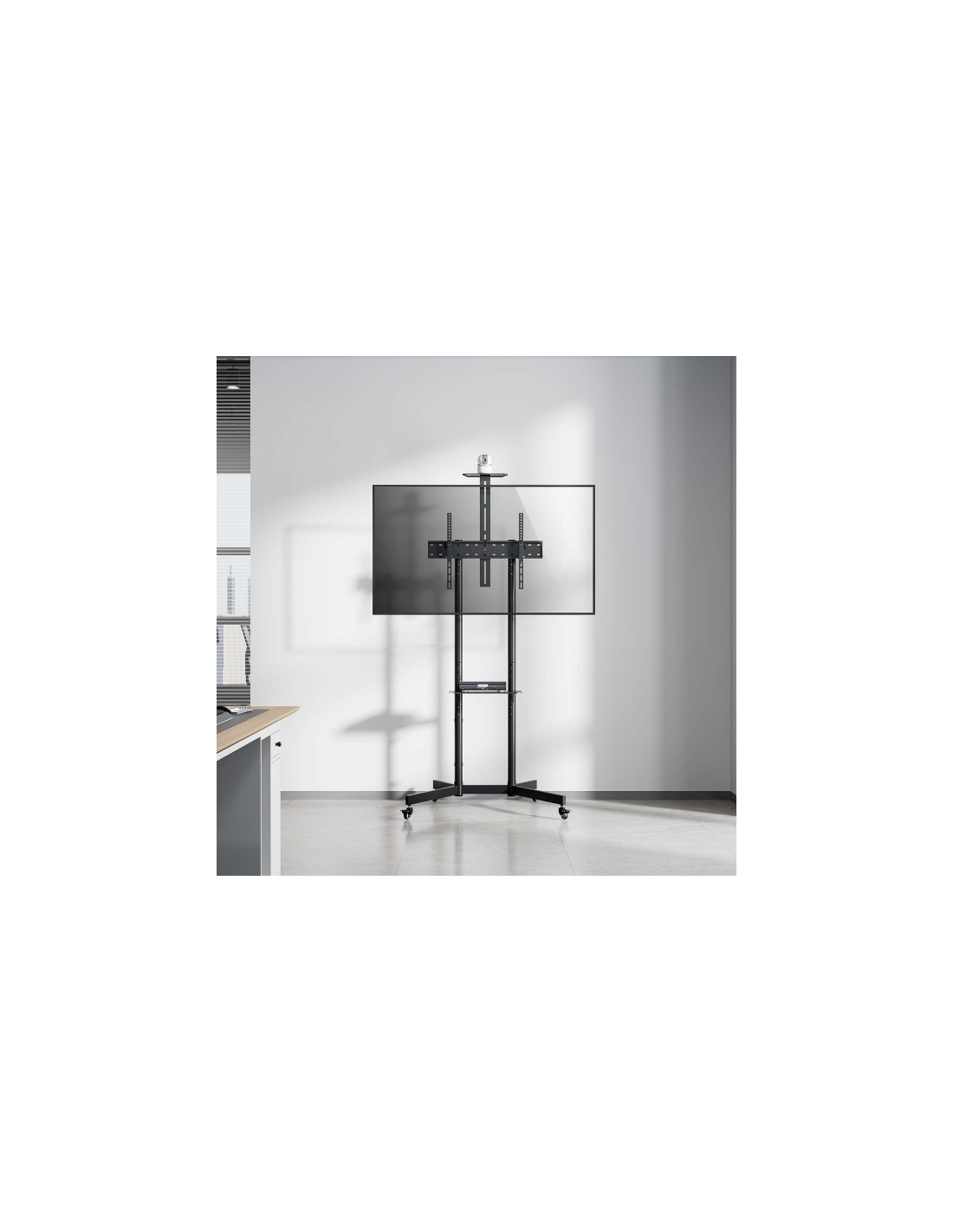Características:- Soporte de suelo eco con rueda, bandeja para DVD y soporte de cámara para monitor/TV de 37”-70”