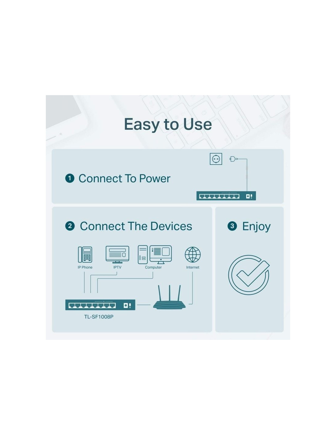 El TL-SF1008P es fácil de instalar y utilizar No requiere ningún tipo de configuración o instalación. El switch PoE de sobremesa con 8 puertos 10/100 Mbps TL-SF1008P de TP-LINK ofrece un rendimiento y calidad excepcionales por lo que resulta una excelente opción para ampliar tanto su red doméstica como la de su oficina.