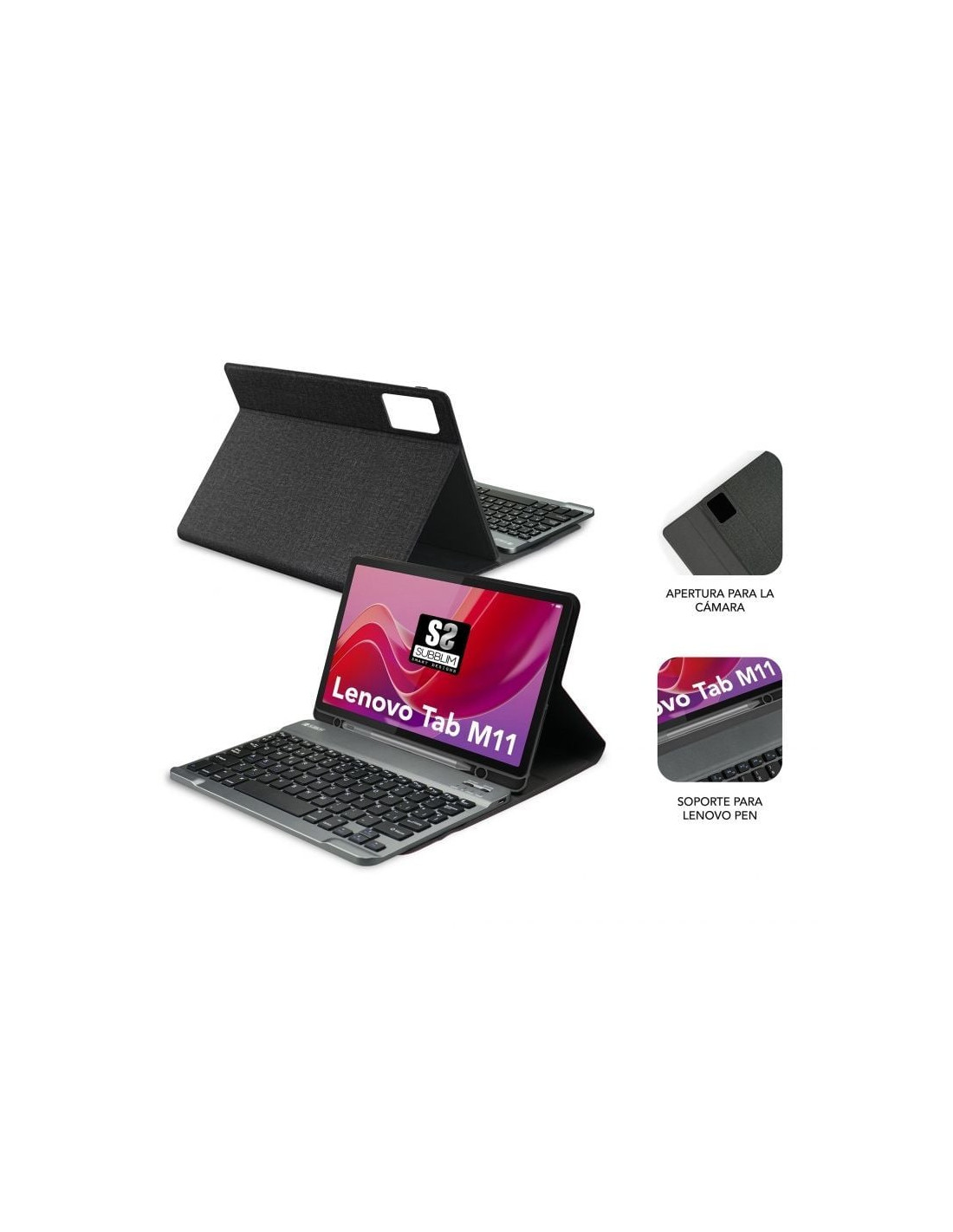 Sistema Magnético. El teclado Bluetooth es completamente extraíble y se conecta a la funda de manera segura mediante un sistema de potentes ,imanes. Este enfoque inteligente no solo asegura una unión estable sino que facilita la separación para una versatilidad total. El sistema de cierre, ,utilizando una solapa magnética, añade una capa adicional de seguridad y sofisticación. Diseño Ultradelgado Exclusivo. Este teclado Bluetooth con funda es líder en el mercado en términos de delgadez y ligereza. Diseñado ,exclusivamente para la Tablet Lenovo Tab M11, se destaca por su perfil ultradelgado que no solo añade elegancia sino que también minimiza el ,espacio ocupado. Fabricado con los mejores materiales disponibles, garantiza durabilidad y calidad excepcionales. Slot Lenovo Pen. Dispone de un exclusivo Slot para transportar el Lenovo Pen con total tranquilidad y protección.Especificaciones