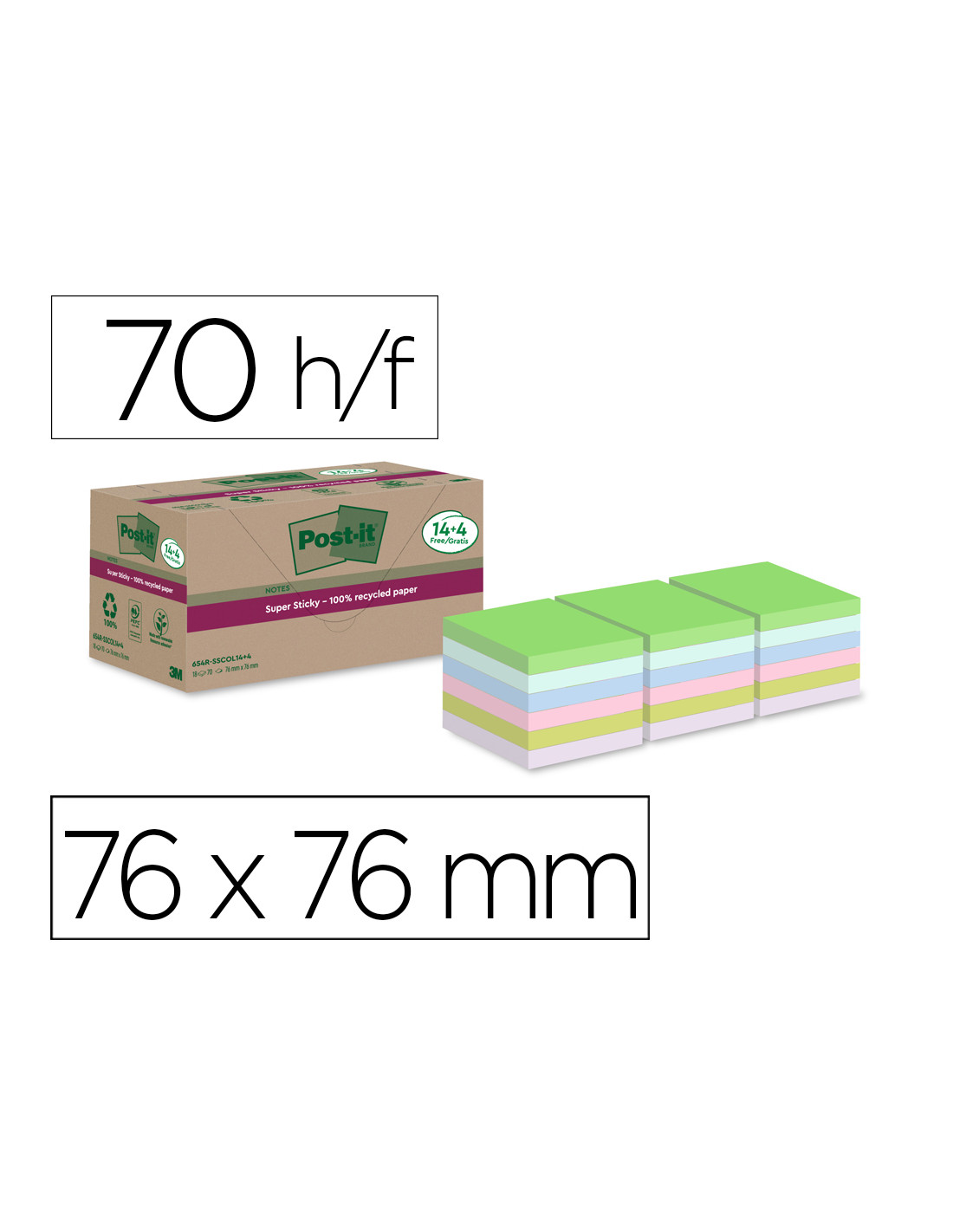 Descubre la practicidad y sostenibilidad con este paquete de bloc de notas adhesivas. Diseñadas para ofrecer una adhesión potente, las notas Super Sticky de Post-it son perfectas para cualquier entorno, ya sea en el hogar o en la oficina. Su tamaño compacto de 76x76 mm y su confección con materiales reciclados las convierten en una opción ecológica sin comprometer su calidad inigualable.