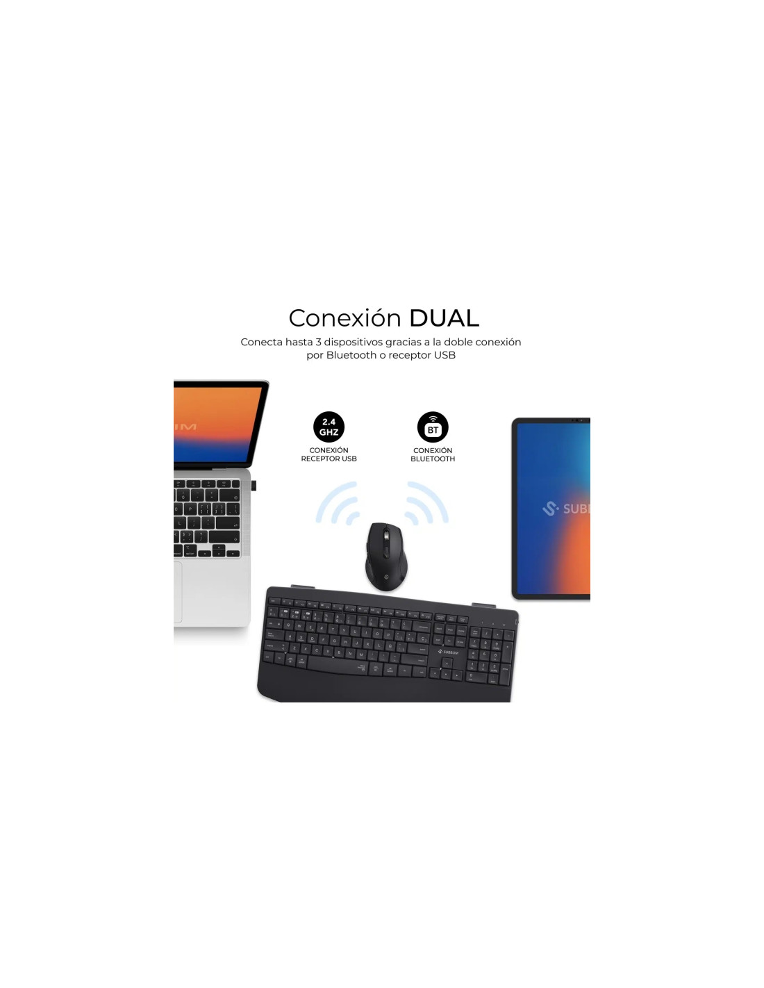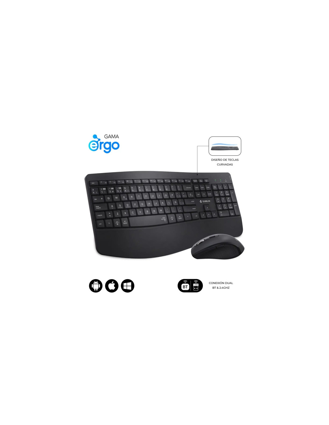 Subblim Dual Office Prowave Black Pack de Teclado Ergonomico + Raton 3200dpi Inalambricos Bluetooth 5.3 y Receptor USB - Bateria