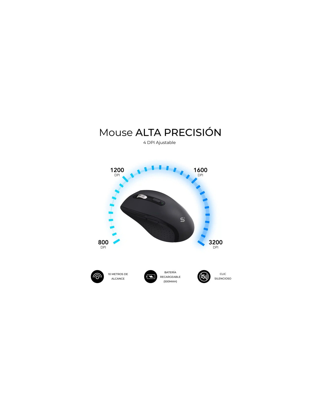 Ratón Ergonómico y Preciso.Diseño para uso diestro, con clic silencioso y botones laterales de Avanzar/Retroceder. Ajusta su sensibilidad entre 800/1200/1600/3200 DPI para mayor precisión.
